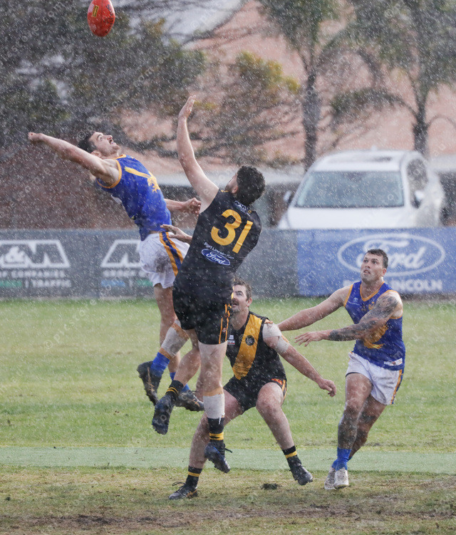 Jackson Masin winds up to whack the ball forward for Lincoln South against Boston ruckman Daniel Dorward. (484771_05)