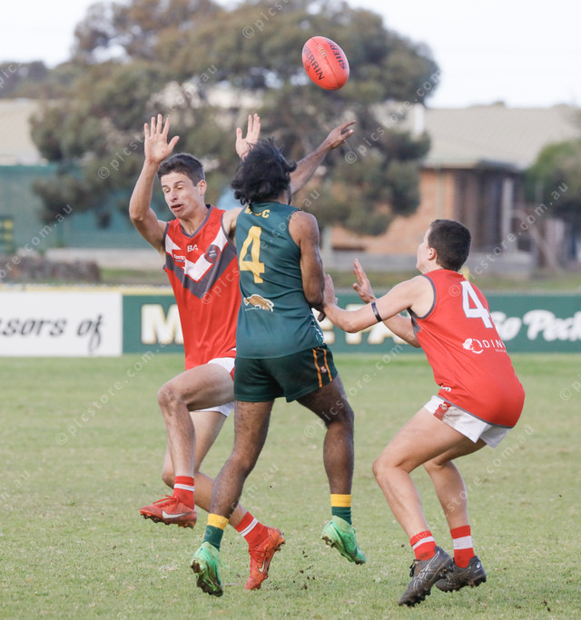 Mallee Park’s Jamaine Abrahamson-Davey taps the ball away from Tasman Imperial’s Sam Lydeamore and Jack Robinson. (484771_10)