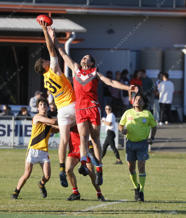 Tasman Imperial’s Dylan George and Boston’s Dan Dorward go head to head in the ruck contest. (486093_02)