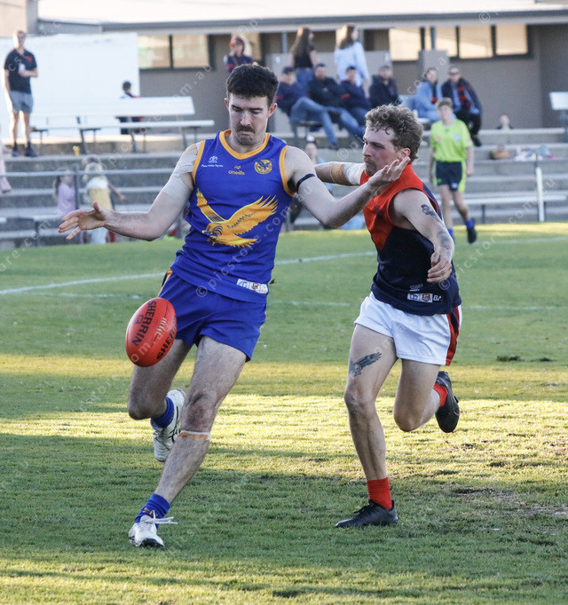 Ben Shillabeer gets his kick away for Lincoln South as Wayback’s Ned West closes in. (486093_06)