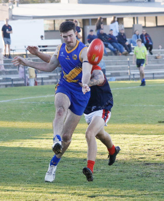 Lincoln South’s Ben Shillabeer kicks down the wing, under pressure from Wayback’s Ned West. (486093_12)