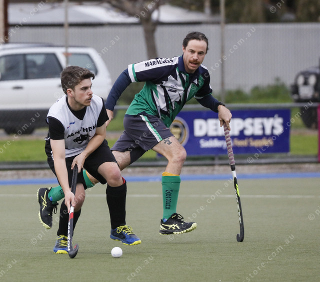 Harry Stockham of Panthers looks up the field as Marauders’ Felix Trebilcock watches on in the A grade men grand final. (Jack Davies: 502435_07)