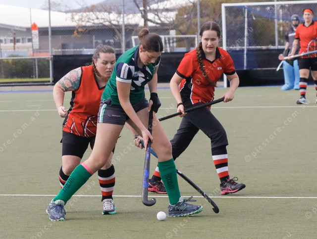 Ayla Pocock controls the ball for Marauders, under pressure from Flinders’ Brooke Green and Clara Neate. (Jack Davies: 494656_01)