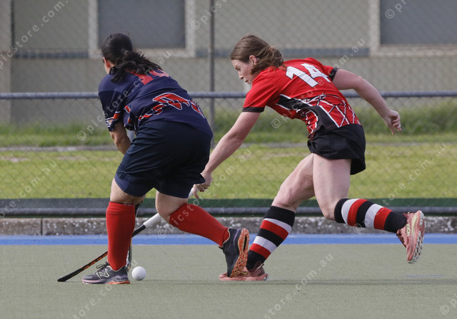 Wanderers’ Tanya Howell and Flinders’ Sally McIntyre vie for the ball in the women’s B grade. (496048_02)