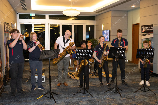 Port Lincoln High School concert band The 23s. Pictured from left are Lucas Dixon, Simon Hennessy, Mr Colin Campbell, Dhanura Madiarachchige, Jordan Webster (back), Kiarna Letton, Loch Osborne and Port Lincoln Primary student Braxton Proctor.(497350_12)