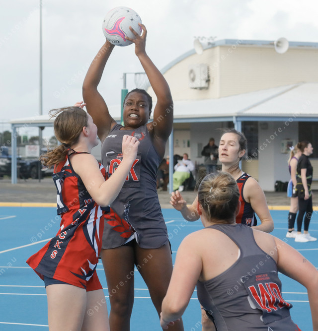 Tasman Imperial goalkeeper Blu Ekujumi catches the ball over Wayback goal attack Libby Hoopmann. (492891_01)