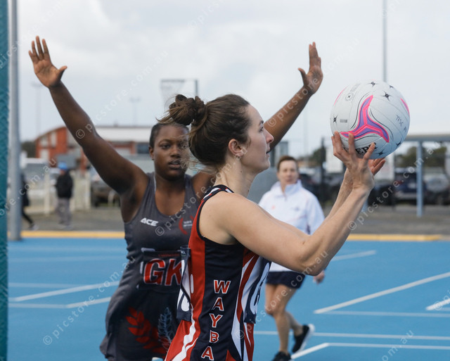 Goal shooter Tash Paul passes the ball for Wayback as she is defended by Tasman Imperial goalkeeper Bolu Ekujumi. (492891_05)