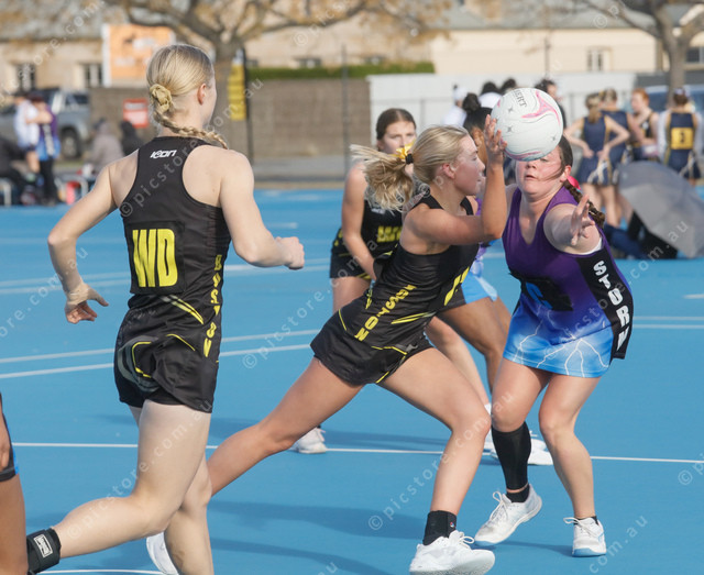 Boston centre Georgia Palm tries to move the ball across the court. Watching on is Boston wing defence player Paige Rees. (492891_07)