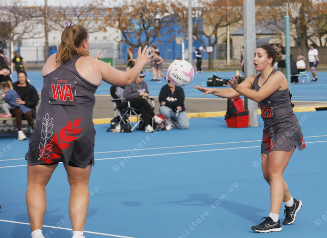 Tasman Imperial wing defence Tayla Milligan passes short to wing attack Jordan Sladdin. (495685_01)