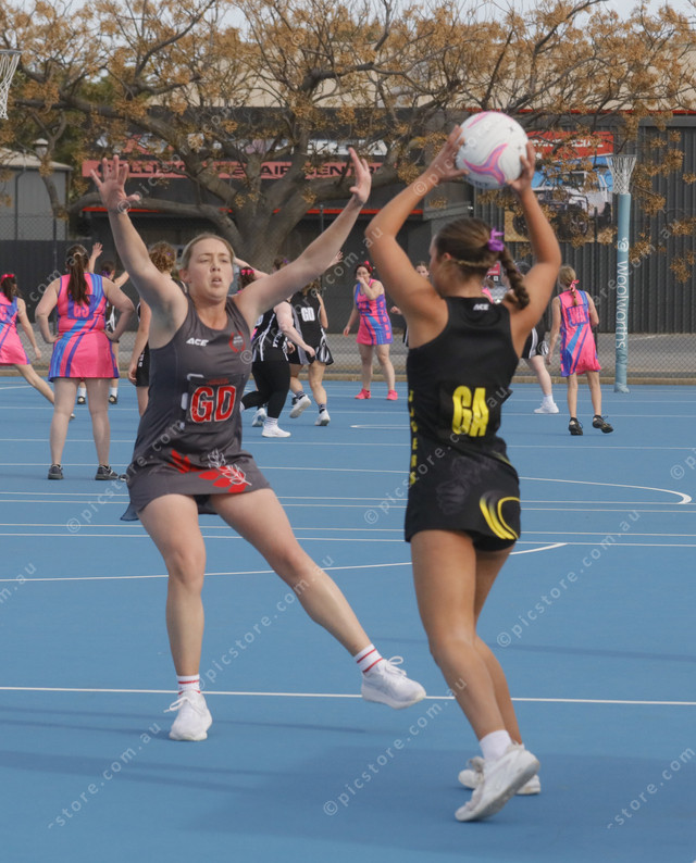 Tasman Imperial goal defence Jess Harris defends against Boston goal attack Taya Fowler. (495685_02)