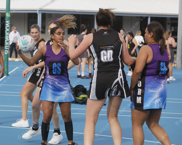 Ravendale Storm goalshooter Shanaya Cook looks for goal attack Zaneeta Walsh who is defended by Wanilla Rangers goal defence Jess Nielsen. (495685_07)