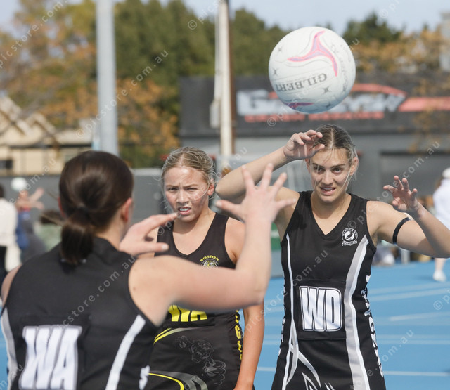 Wanilla Rangers wing defence Emily Young passes to wing attack Lilee Trenowden. Boston wing attack Paige Rees watches on. (497264_02)