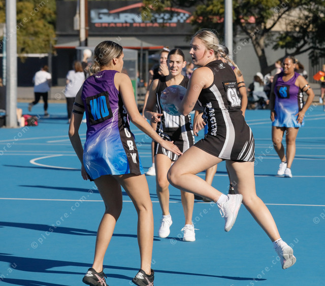 Summer Pedersen takes the ball for Wanilla ahead of Ravendale Storm’s Phyllis Dorizzie. (477628_02)
