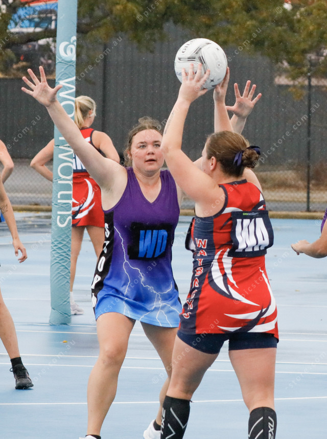 Harmony Sincock defends for Ravendale Storm as Wayback goal defence Alana Jantke looks to pass. (479154_04)