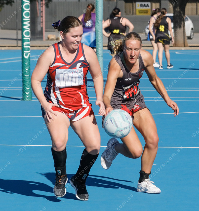 Wayback’s Alana Jantke and Tasman Imperial’s Lacey Whillas vie for the ball. (Jack Davies: 482094_02)
