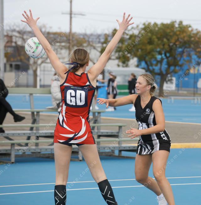 Wanilla goal attack Summer Pedersen passes down the court as Wayback goal defence Dekoda Hunt blocks the middle. (484775_05)