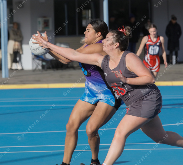 Ravendale Storm goal defence Lakeesha Pickett catch the ball before Tasman Imperial goal shooter Lauren Simes could get a hand in. (484775_07)