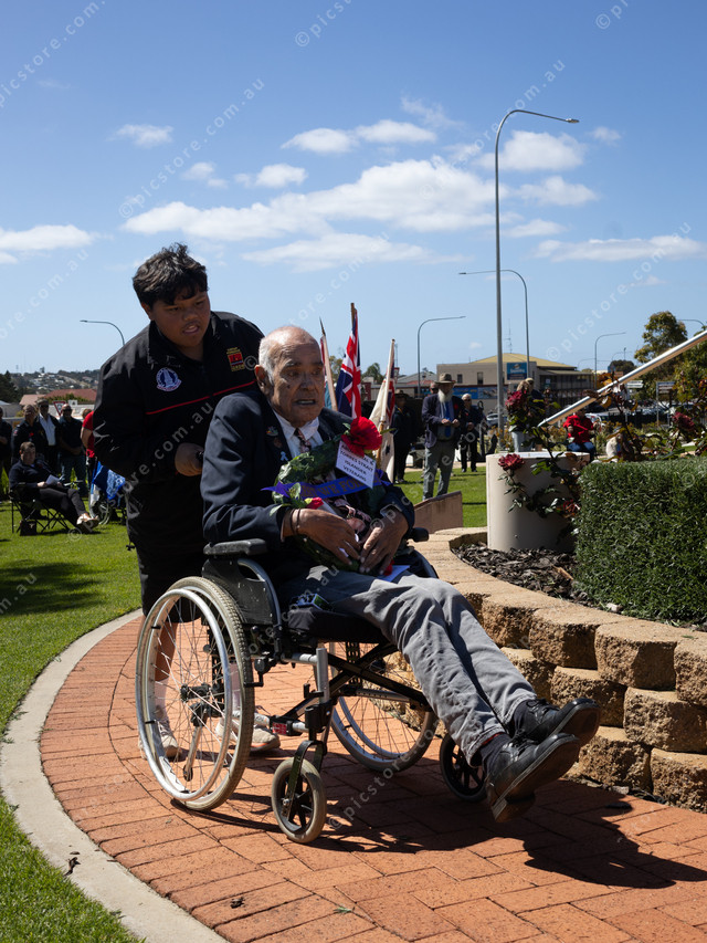 Port Lincoln High School Clontarf Academy student Scott Kropinyeri assists Gil Green who laid a wreath for the Aboriginal and Torres Strait Islander veterans. (516897_06)