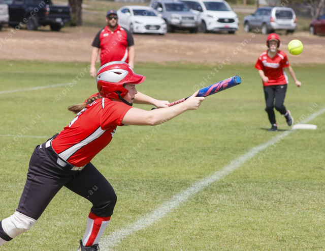 Alana Jantke bunts the ball into the field for Squaws’ A grade team. (522018_08)