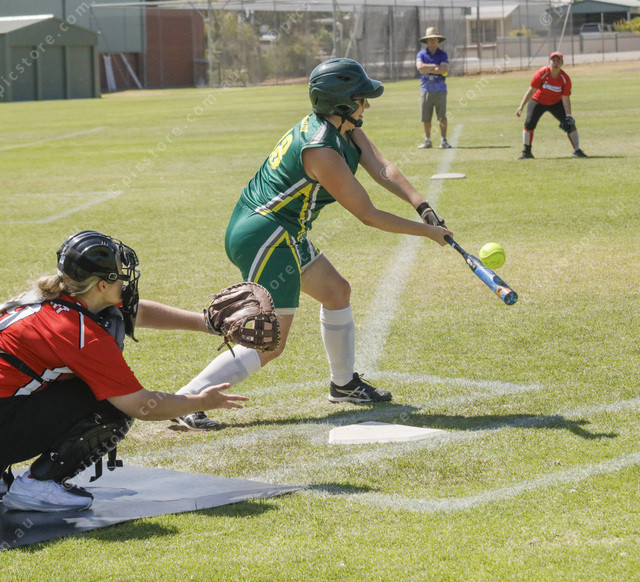 The bat of Roadrunners’ Tanya Habner connects with a low ball in the A grade semi-final. (535449_03)