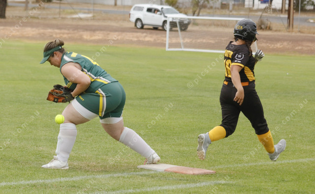 Shields’ Liza Porter is safe at first base as Roadrunners’ Brooke Neindorf tries to gather the ball in the A grade match. (536958_03)