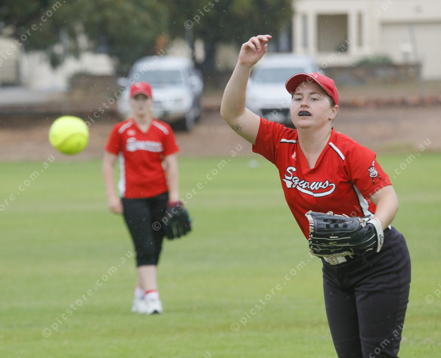 Squaws’ pitcher Alana Jantke watches her pitch fly through the raindrops. (538135_21)