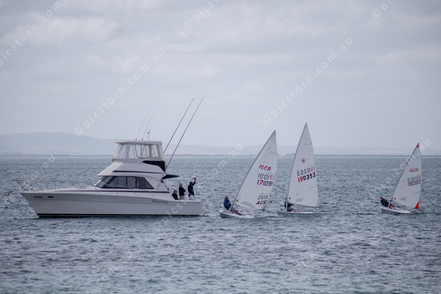 The laser fleet of Mike Stockdale, Angus Bubner and followed by Tiff Evans during the sail past.