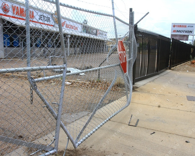 MANGLED: The twisted gates at the police compound after they were ram raided. (PIC: PHIL WILLIAMS 447971_03)
