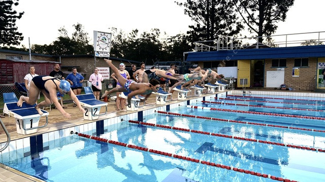 Friends, team mates and returning swimmers, dive into the water for the 200m butterfly event to honour Roschanna Snow (Jess Leis: 536016_08)