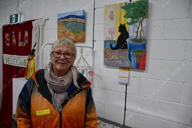 Mary Bateman with her piece, ‘Cat contemplates lotus’ at the Bridge to Nowhere Arts Association exhibition (Neralie Bailey: 493987_04)