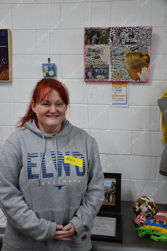 Melissa Castle with her collage piece at the Bridge to Nowhere Arts Association exhibition (Neralie Bailey: 493987_05)