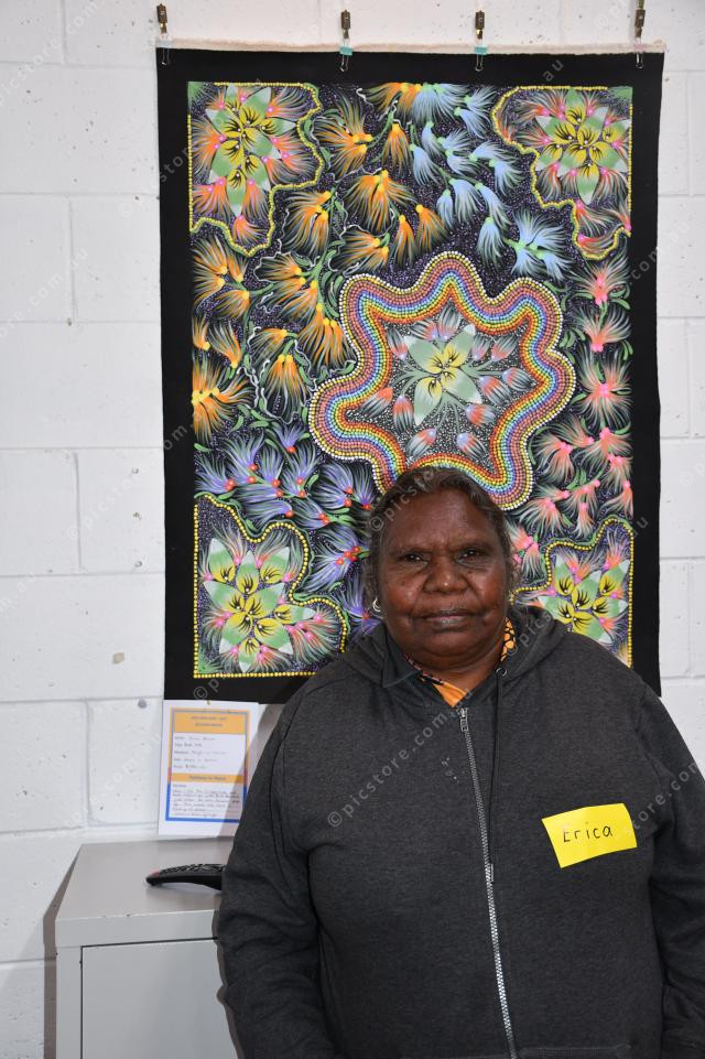 Erica with her acrylic on canvas piece ‘Bush Path’ at the Bridge to Nowhere Arts Association exhibition (Neralie Bailey: 493987_06)