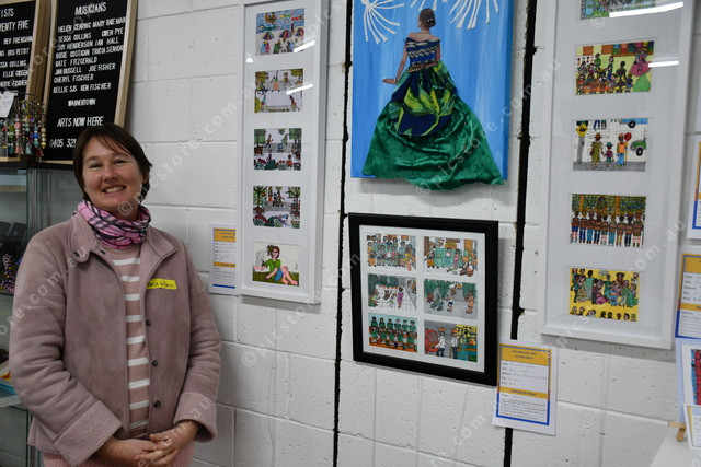 Alexandra Collins with her mixed media exploring themes of family at the Bridge to Nowhere Arts Association exhibition (Neralie Bailey: 493987_07)