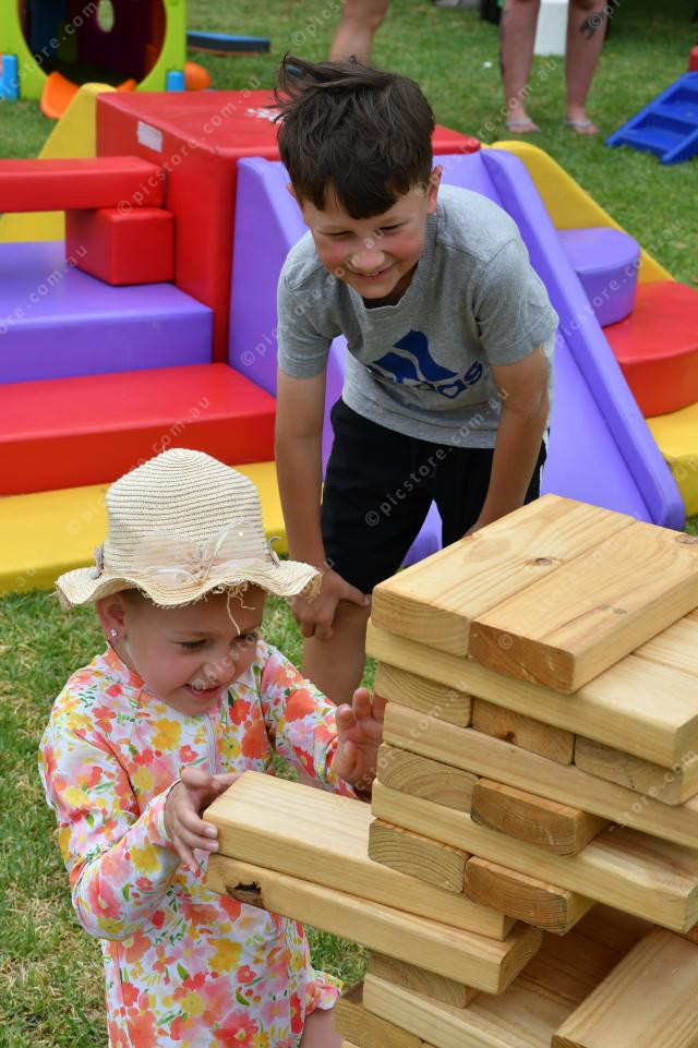 Bentley and Miley Sadler enjoyed the giant Jenga game at the 2025 Australia Day event in Port Pirie (Neralie Bailey: 455706_29)