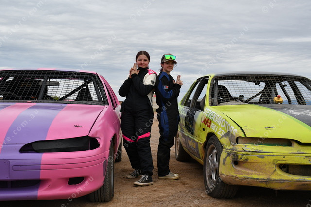 Two of the young guns of dirt circuit racing in Port Pirie, Tosca Wobring with her EL Falcon and Gemma Brookman with her VR commodore (Neralie Bailey: 500173_04)