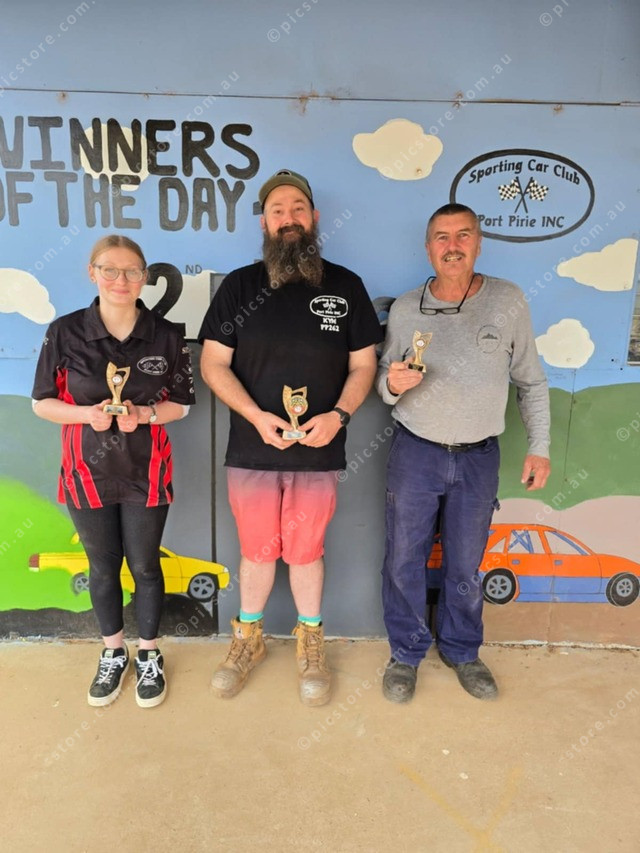 B Grade placegetters at the dirt circuit in August were first (centre) Kym Brookman, second (on left) Chloe Frick and third Brian Chaplin (supplied)