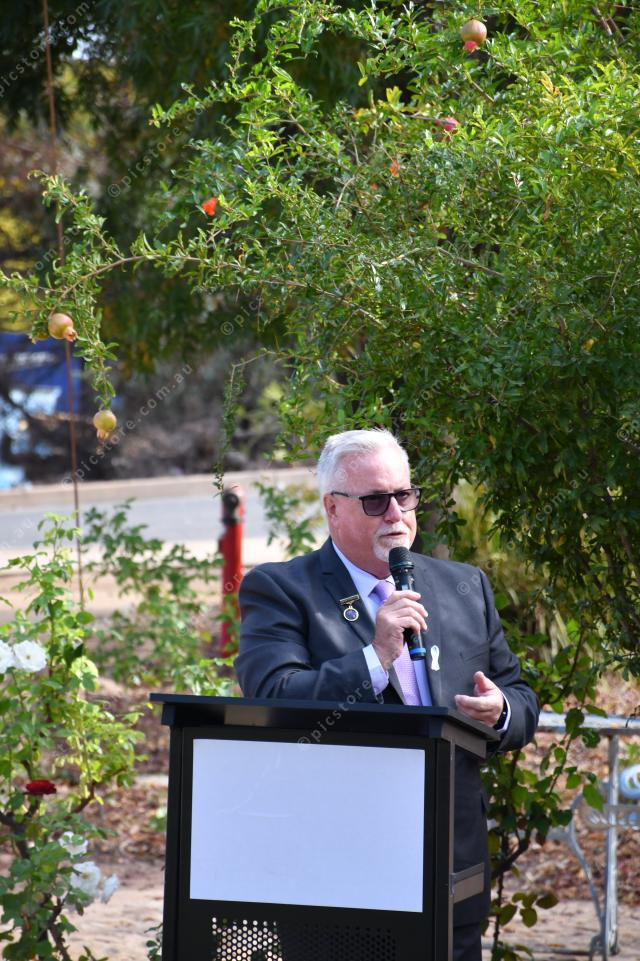 Port Pirie Regional Council Mayor Leon Stephens spoke at the unveiling of the Port Pirie Red Bench in the Women’s Keepsake Garden at the Port Pirie Regional Library (Neralie Bailey: 476731_02)