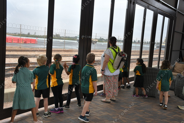 Risdon Park Primary School children and teacher Magdy Jagiello check out the view from the dining area at the Railway Station Museum (Neralie Bailey: (Neralie Bailey: 467400_12)