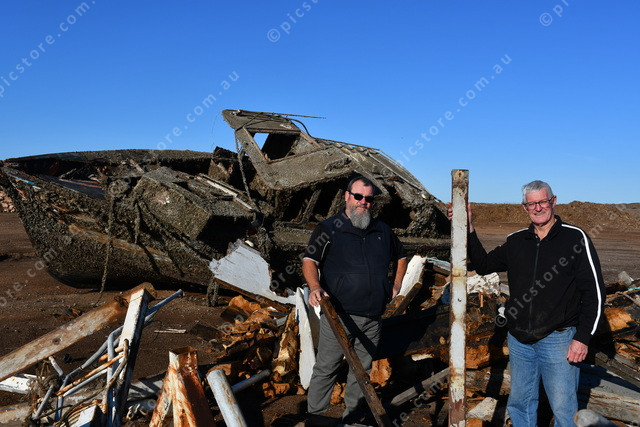 Director of Development and Regulation Chris Davey with Michael Slattery and wreckage from the Myona at the Port Pirie Waste Transfer Station and the remains of a sunken boat retrieved from the harbour (Neralie Bailey: 487349_02)