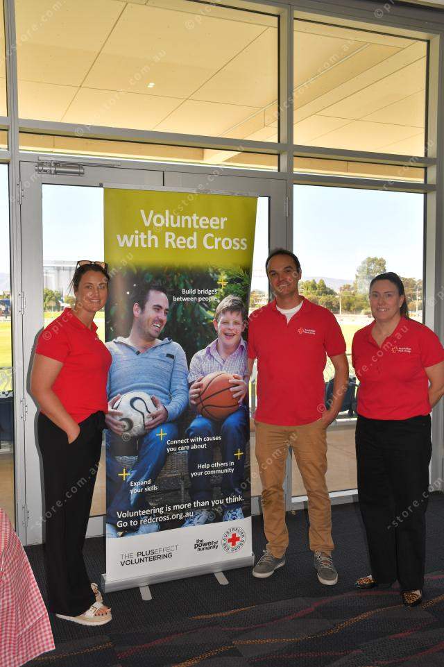Andrew Quin and Bec Cunningham from the Red Cross Community Mobilisation Team with Sarah, National Senior Manager Members and Volunteering at the World Red Cross Day event (Neralie Bailey: 476982_05)