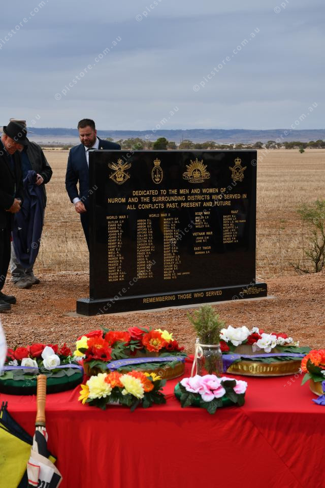 Pastor Brian Keller and veteran Scott Bowman unveiling the Nurom Whim War Memorial and Anzac Commemoration Service (Neralie Bailey: 474283_01)