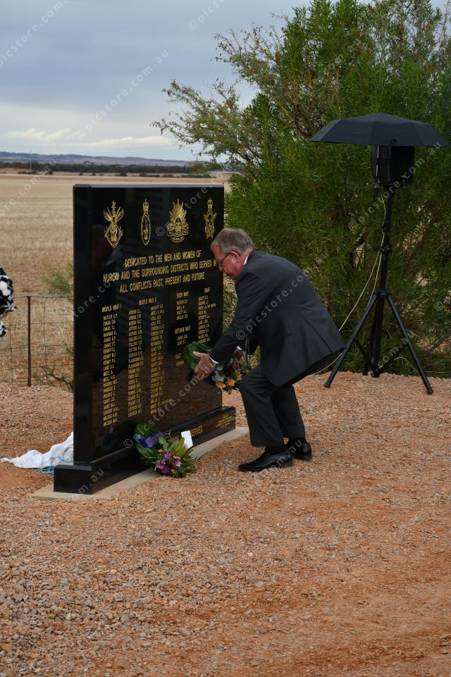 Geoff Brock MP lays a wreath at the unveiling of the Nurom Whim War Memorial and Anzac Commemoration Service (Neralie Bailey: 474283_06)