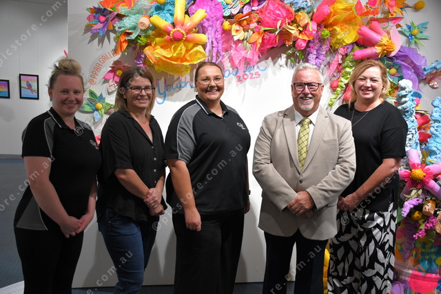 John Pirie Secondary School teachers Erin Patterson, Megan Congdon and Lauren Richards with Leon Stephens and Cr Leeanne Peters. (Tosca Wobring: 521928_04)