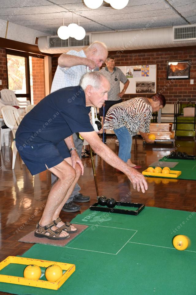 Fred playing for the yellow team in the indoor bowls at the Port Pirie Senior Citizens Club (Neralie Bailey: 459211_05)