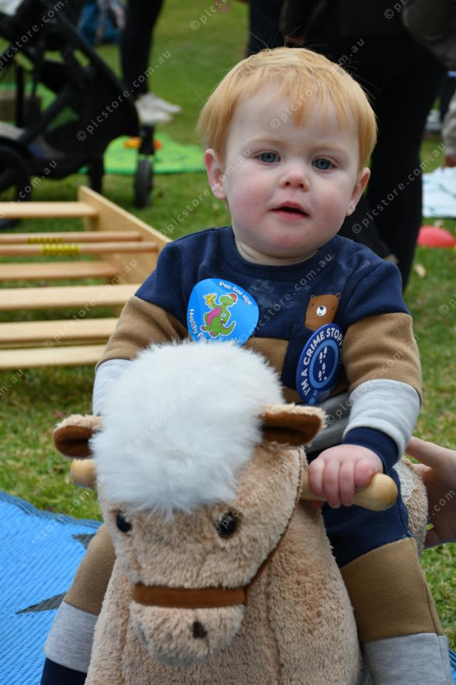 At Family Day at the Library, Colt playing on the rocking horse (Neralie Bailey: 482784_05)
