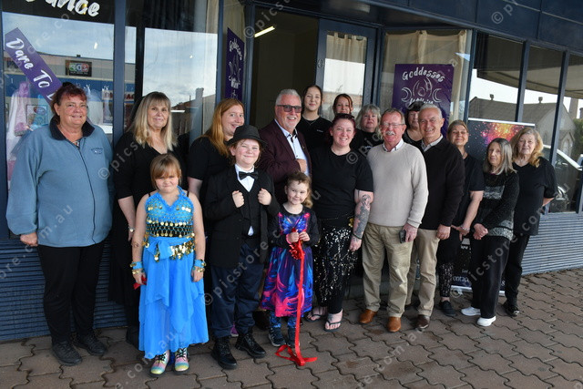 Goddesses Within Belly Dance Troupe members with Mayor Leon Stephens, Geoff Brock MP and Deputy Mayor Alan Zubrinich at the official opening on their new studio (Neralie Bailey: 495488_15)