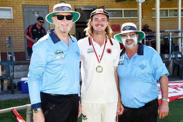 Umpires Mick McMahon and David Huntington with man of the match Matt Welsh 467311_28