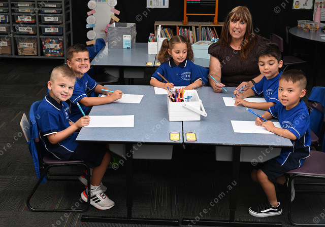 Sydenham Primary School. Pic of principal Effie Sultana with preps: Rafael, Dario, Julia, Spencer and Archer. (Damjan Janevski). 530071_05