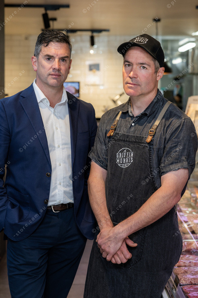 L-R Brad Battin and Stephen Morris inside Griffin and Morris Butcher’s Berwick.