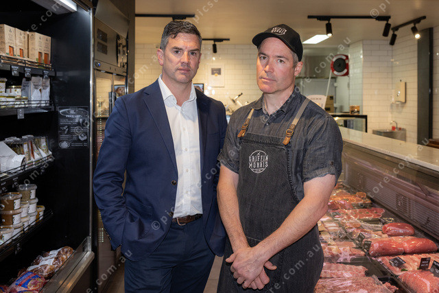 L-R Brad Battin and Stephen Morris inside Griffin and Morris Butcher’s Berwick.